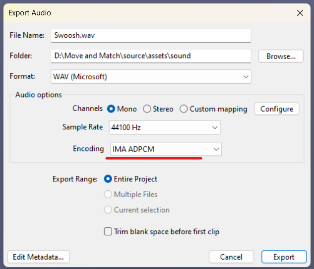 It’s also useful to save sounds and music in mono, which halves the file size.